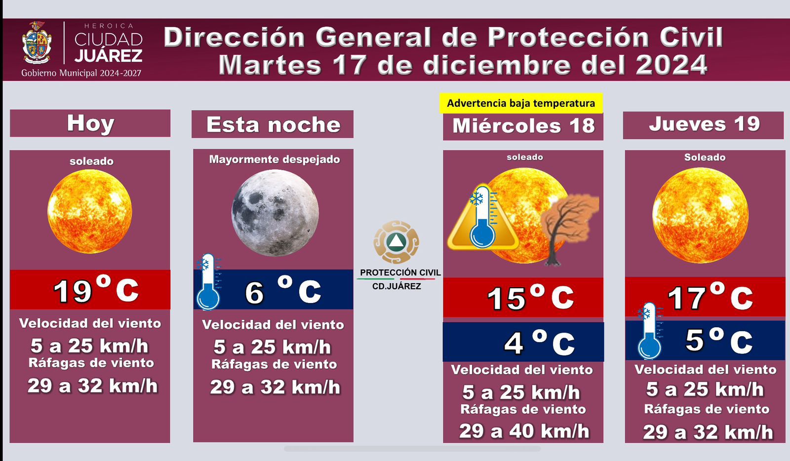 Protección Civil ha emitido una advertencia por clima frío, mientras que el viento continuará con velocidades entre los 5 y los 25 kilómetros por hora y ráfagas más fuertes, de hasta 40 kilómetros por hora.