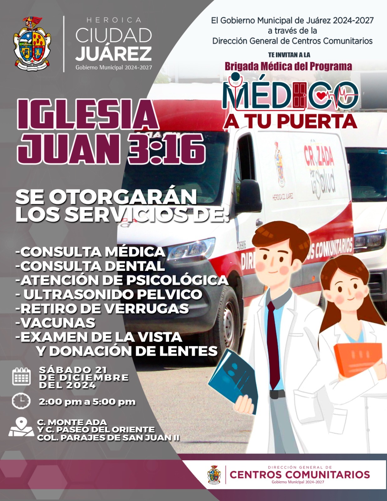 La Dirección General de Centros Comunitarios llevará a cabo una edición más de la brigada Médico a tu Puerta, servicio que se dará a la comunidad mañana sábado 21, de 2:00 a 5:00 de la tarde en la Iglesia Juan 3:16, ubicada en la colonia Parajes de San Juan II, en la intersección de las calles Monte Ada y Paseo del Oriente.