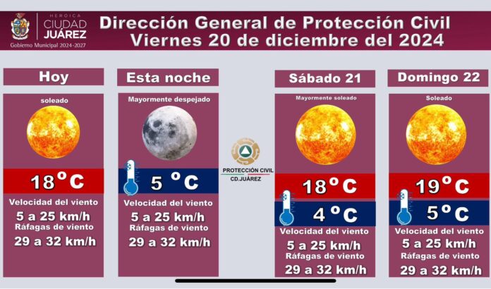 La Dirección General de Protección Civil dio a conocer el pronóstico del clima para hoy viernes 20 y los días siguientes, anticipando condiciones mayormente soleadas con noches frías.