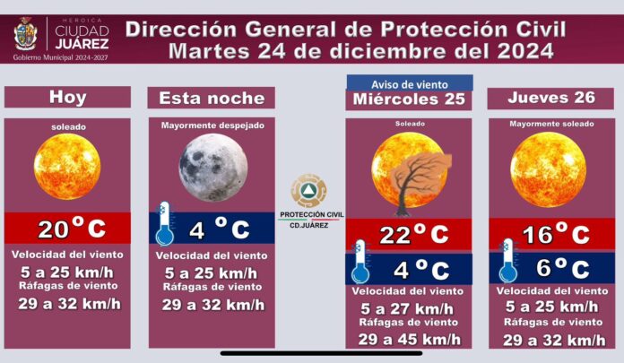 La Dirección General de Protección Civil de Ciudad Juárez informó el pronóstico del clima para los próximos días, destacando condiciones mayormente soleadas, aunque con un aviso importante por vientos fuertes para el miércoles 25 de diciembre.
