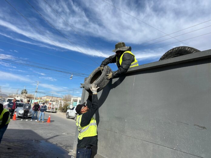 Con el objetivo de salvaguardar la integridad y seguridad de los habitantes de la colonia Campestre Virreyes, en un operativo coordinado con las direcciones de Ecología y Protección Civil, personal de la Dirección de Limpia retiró más de 2,500 llantas en desuso que se encontraban en un domicilio ubicado sobre la calle Namibia.