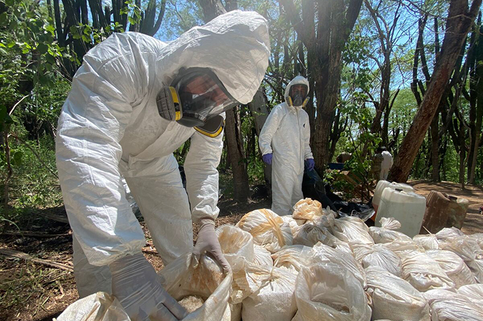 Las fuerzas militares aseguraron 6 mil litros de “sustancias químicas”, nueve toneladas de “materiales sólidos” y maquinaria industrial utilizada para la producción de narcóticos, detalla la SSPC.