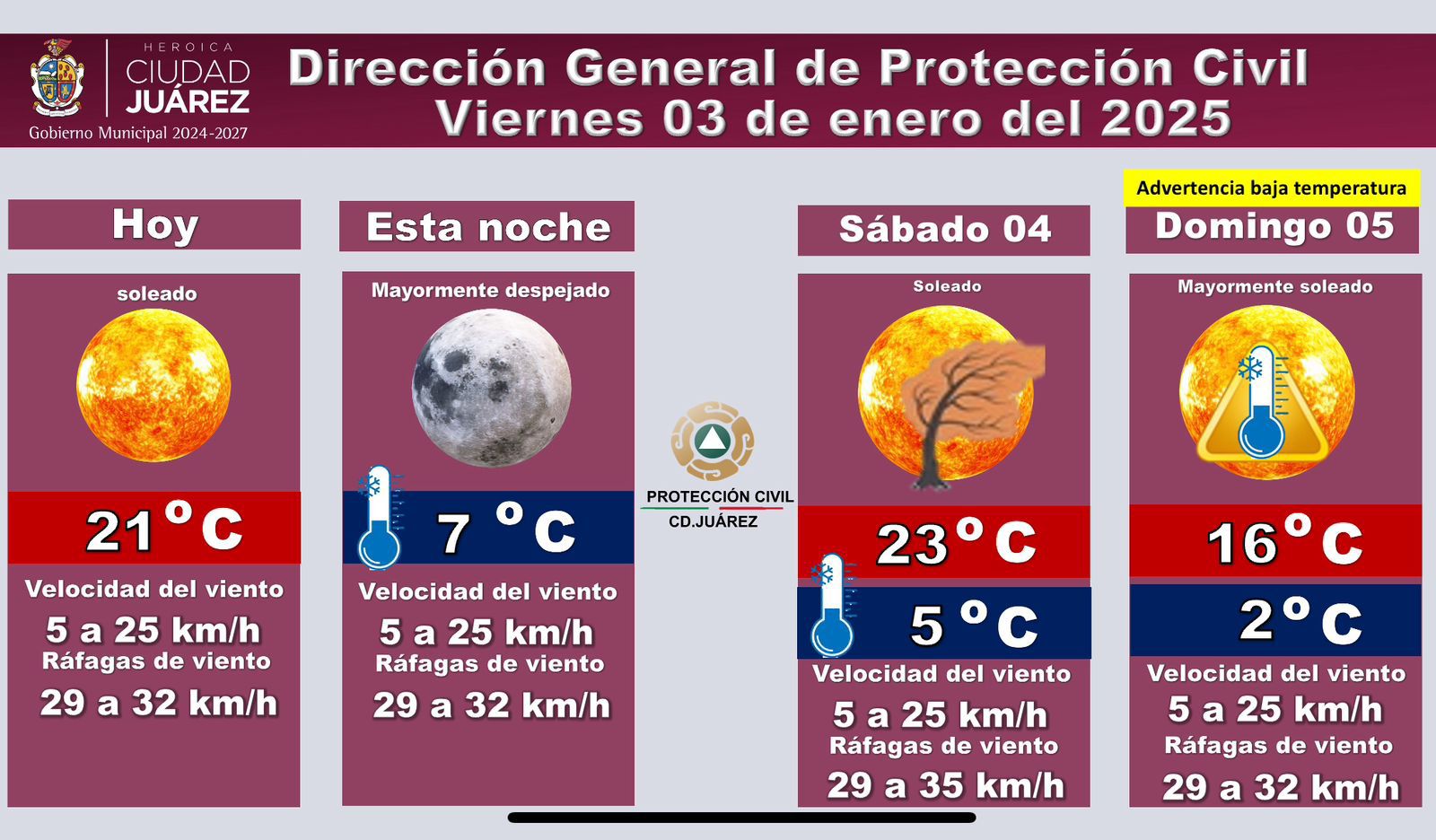 La Dirección General de Protección Civil informa sobre las condiciones climáticas para los días viernes 3 y sábado 4 de enero.