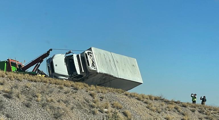 Un camión cargado con carne de res, volcó cuando circulaba en sentido de Delicias a Chihuahua, a la altura del kilómetro 180.