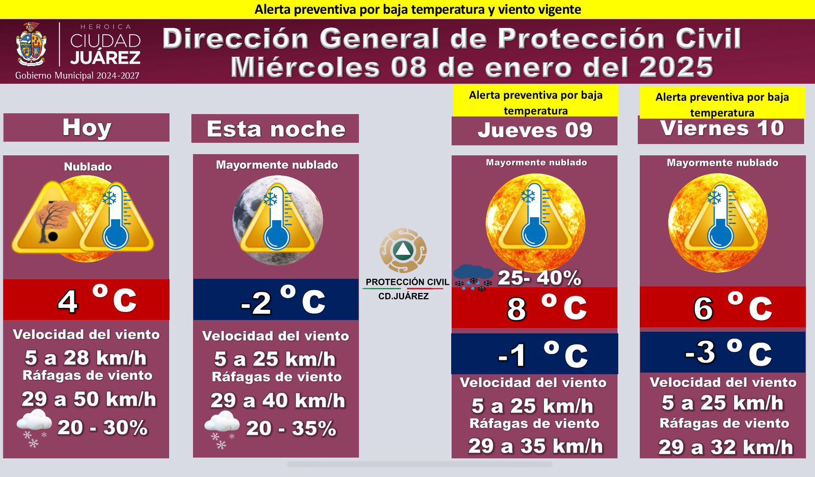 La Dirección General de Protección Civil informó sobre el pronóstico del clima para hoy miércoles 8 y el jueves 9, manteniendo vigente una alerta preventiva debido a las bajas temperaturas y vientos fuertes que afectarán la región.
