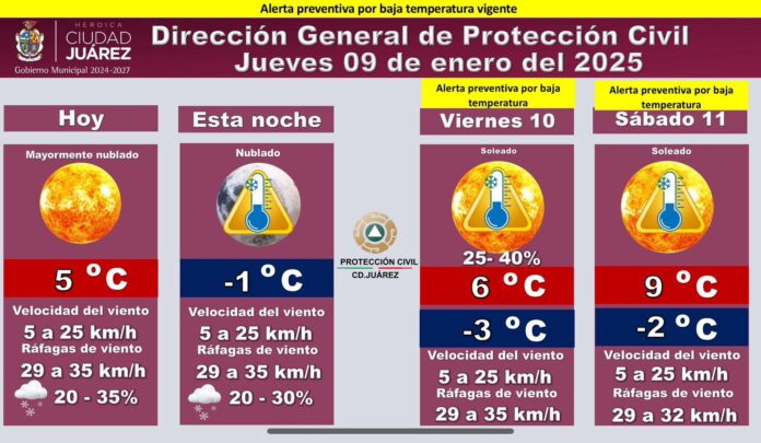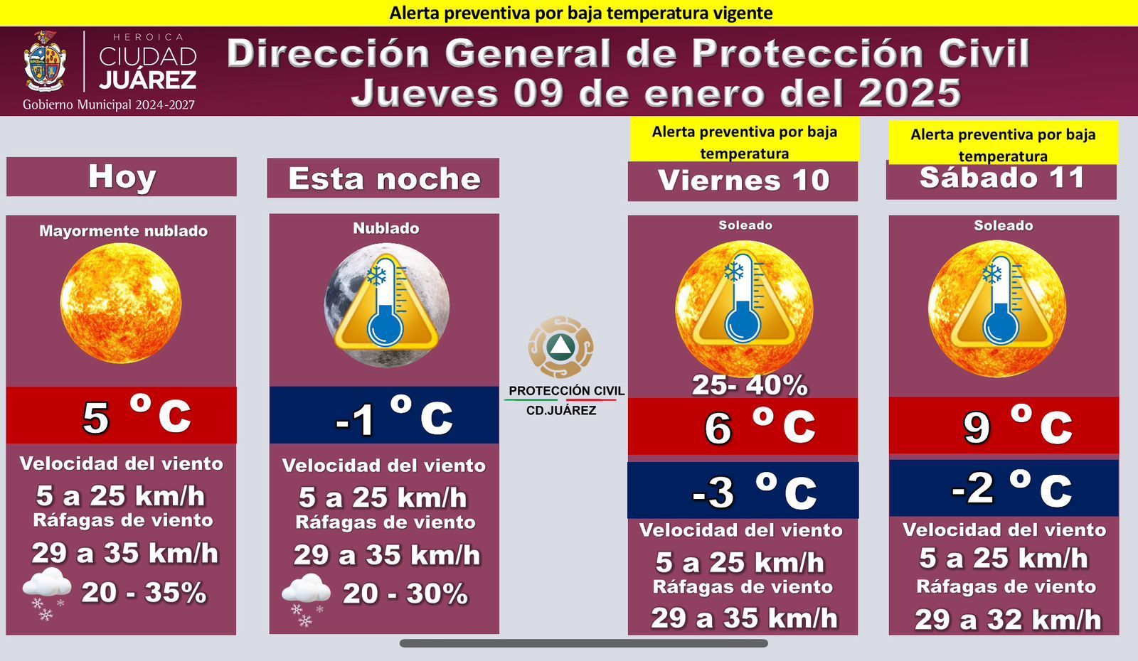 La Dirección General de Protección Civil informó sobre el pronóstico del clima para hoy jueves 9, y los días 10 y 11 de enero, manteniendo vigente una alerta preventiva por bajas temperaturas en la región.