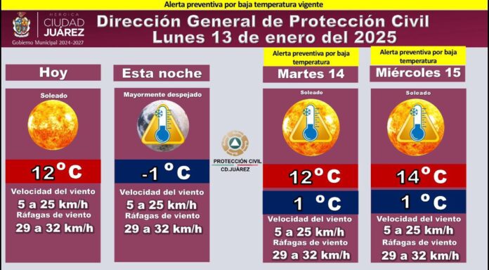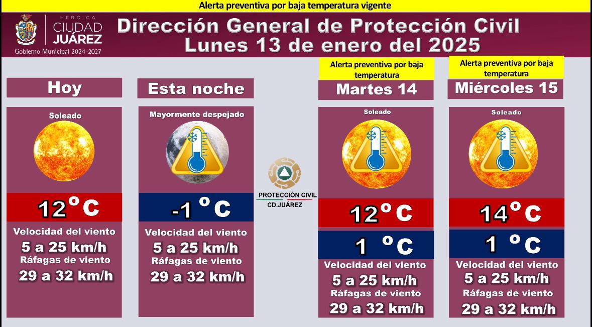 La Dirección General de Protección Civil informa sobre las condiciones climáticas para hoy lunes 13, mañana martes 14 y el 15 de enero, manteniendo la alerta preventiva por bajas temperaturas en la región.