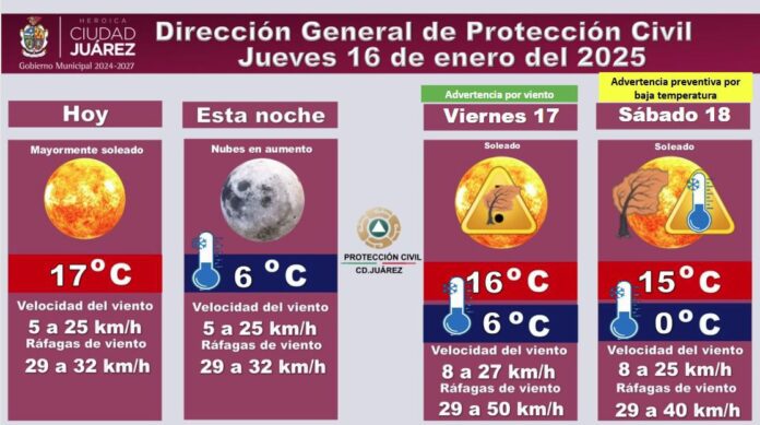 La Dirección General de Protección Civil informó sobre el pronóstico del clima para hoy jueves 16 y los días 17 y 18 de enero, emitiendo una alerta por vientos fuertes para el viernes y una advertencia preventiva por bajas temperaturas para el sábado.