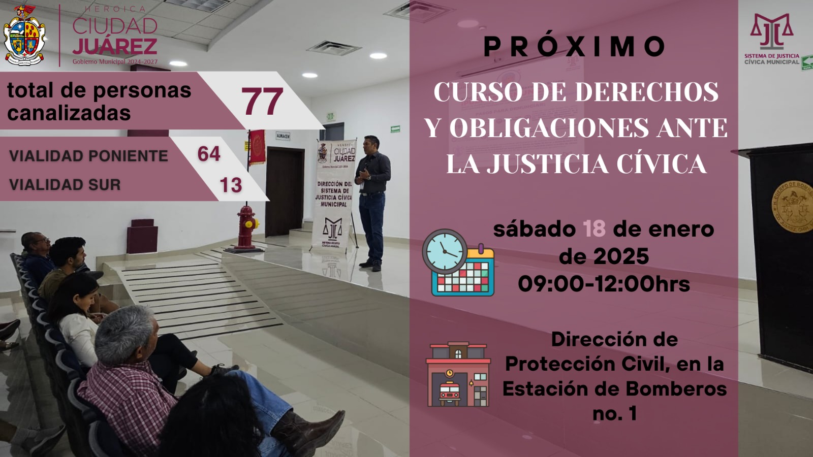 Subrayó que mañana sábado 18 de enero se llevará a cabo el curso “Derechos y obligaciones ante la Justicia Cívica”, el cual se impartirá en las instalaciones de la Dirección General de Protección Civil y en donde se espera acudan 41 personas como medida para mejorar la convivencia cotidiana.