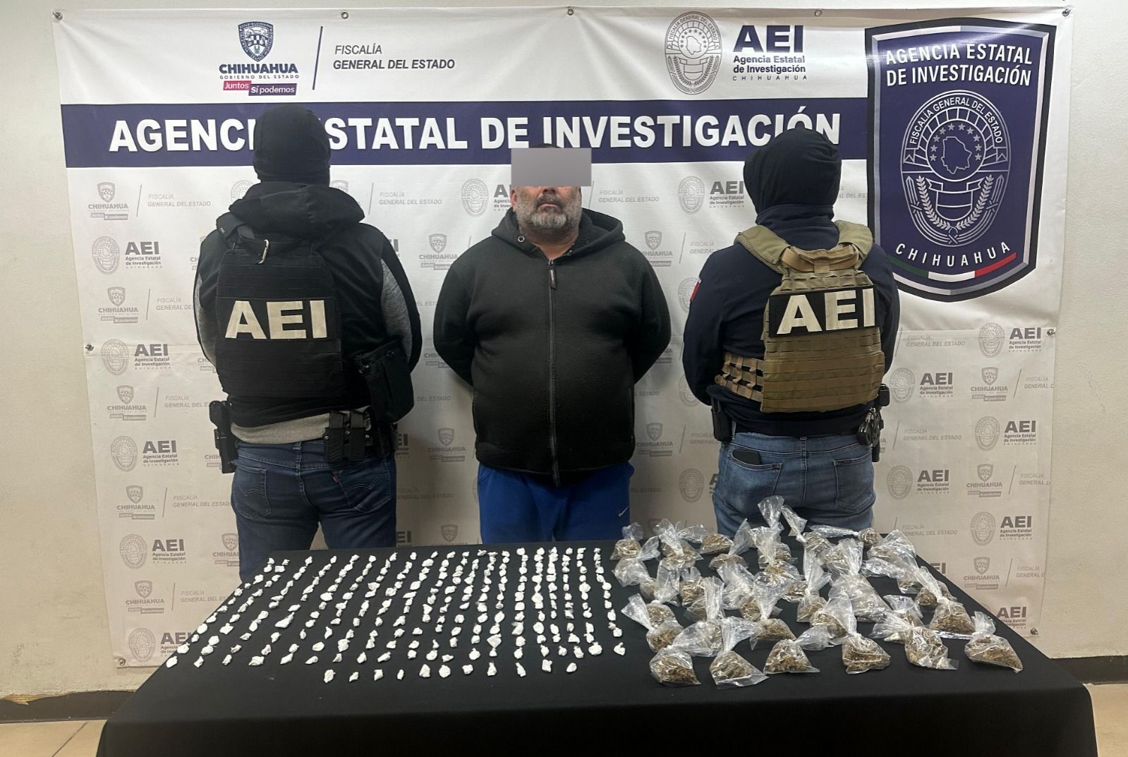 Elementos de la Agencia Estatal de Investigación, adscritos al Centro de Operaciones Estratégicas (COE) de la Fiscalía de Distrito Zona Norte, detuvieron en los términos de flagrancia, a un probable distribuidor de droga en Samalayuca, municipio de Juárez.
