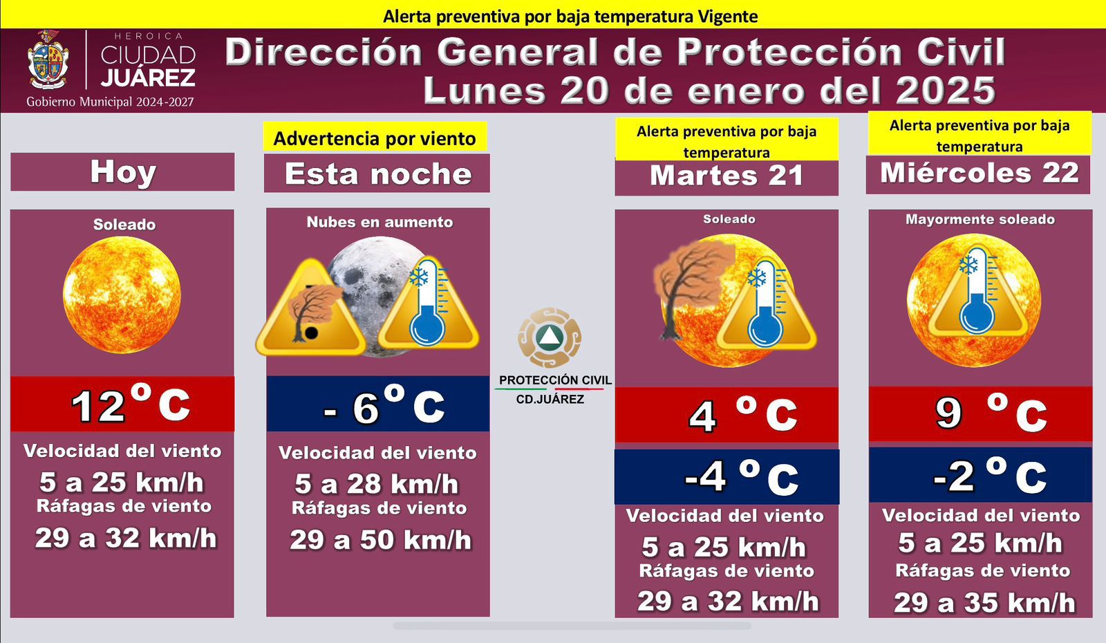 La Dirección General de Protección Civil informó sobre una alerta preventiva por bajas temperaturas, vigente desde este lunes 20 hasta el miércoles 22. Durante estos días, se espera un descenso significativo en la temperatura, acompañado de ráfagas de viento moderadas.