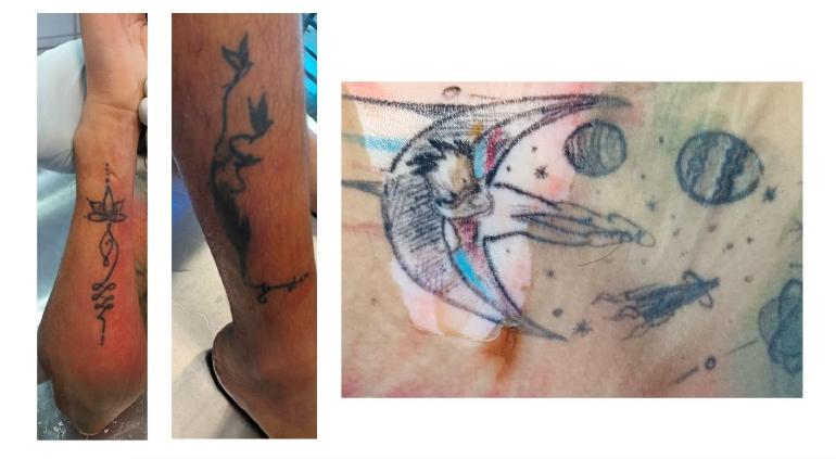 - Imagen de una figura femenina recostada en una luna con planetas en la fosa iliaca izquierda.