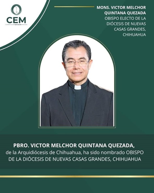 La Nunciatura Apostólica comunica, a través de la Secretaría General de la Conferencia del Episcopado Mexicano, que Su Santidad Francisco se ha dignado nombrar Obispo de la Diócesis de Nuevo Casas Grandes al Pbro. Víctor Melchor QUINTANA QUEZADA, hasta ahora Vicario Episcopal de Pastoral de la Arquidiócesis de Chihuahua.