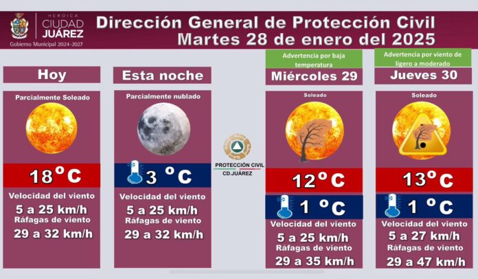 El viento tendrá una velocidad de 5 a los 25 kilómetros por hora, con ráfagas que podrían alcanzar los 35 kilómetros por hora.