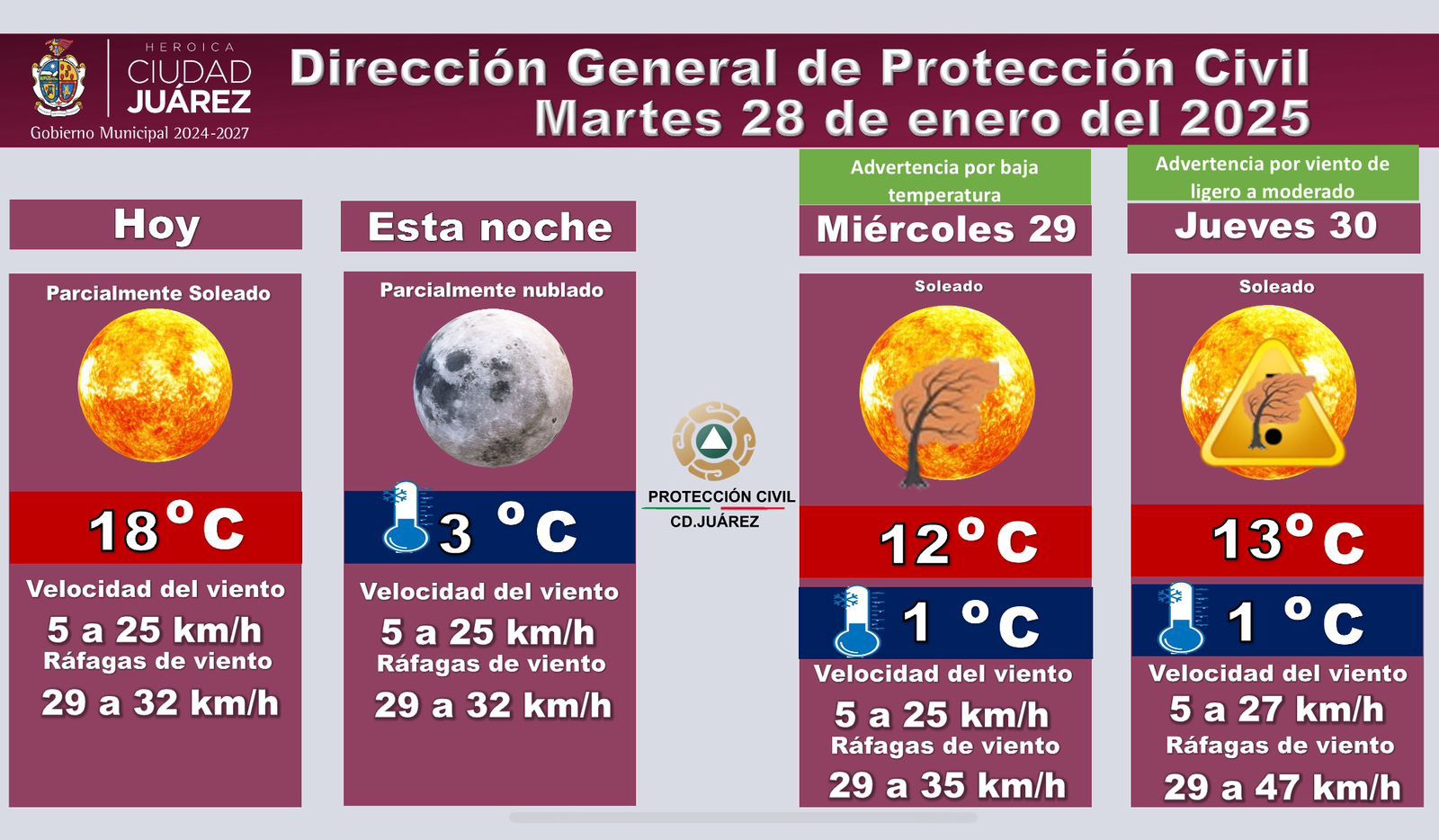 Para mañana miércoles 29 se mantiene una advertencia por baja temperatura. Se prevé un día soleado con una temperatura máxima de 12 °C y una mínima de 1 °C.