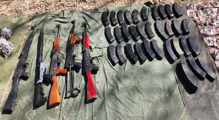 Encontraron además cinco armas largas, algunas de ellas similares a las AK-47, “cuerno de chivo”, y 43 cargadores para las armas.
