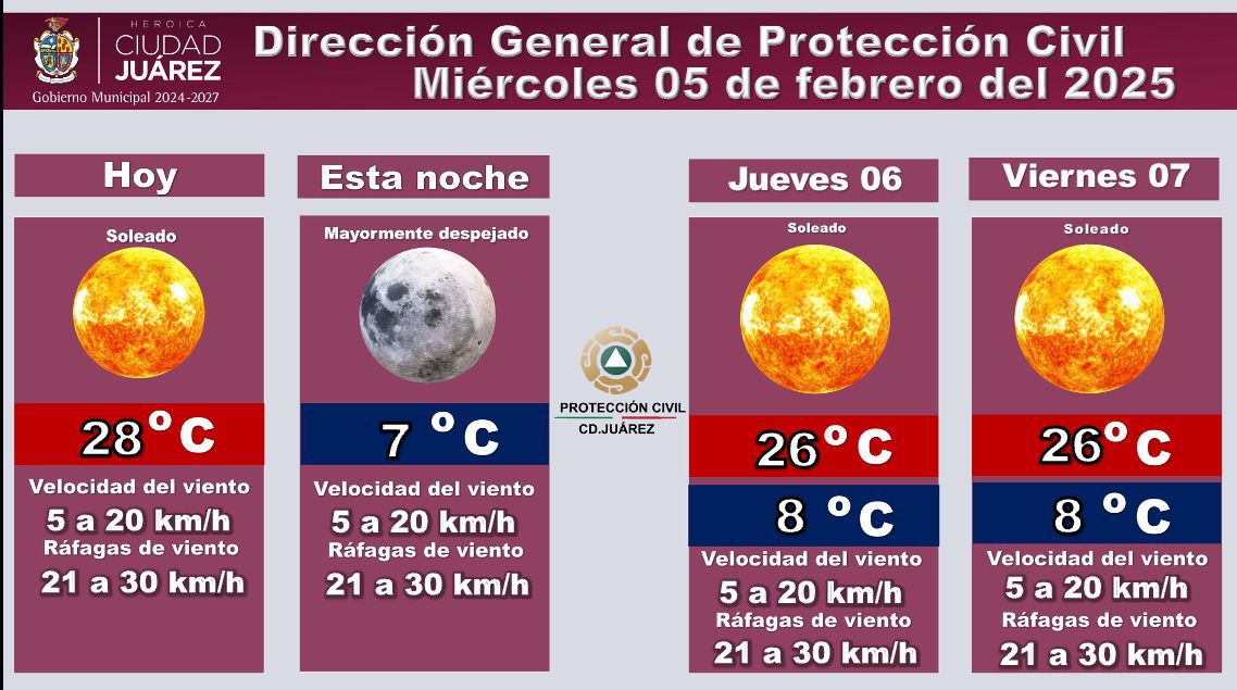 La Dirección General de Protección Civil dio a conocer el pronóstico del clima para los próximos días, indicando condiciones mayormente soleadas y temperaturas moderadas.