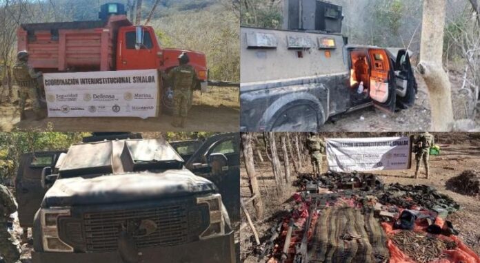 Durante un operativo de la Coordinación Interinstitucional Sinaloa realizaron el aseguramiento de ocho autos en Cosalá, Sinaloa, entre ellos un dompe blindado y una tanqueta.
