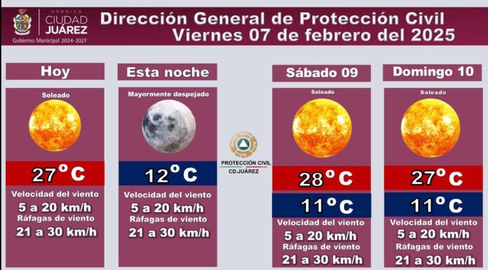 Para el domingo 10 de febrero, el pronóstico indica un día soleado con una máxima de 27°C y una mínima de 11°C.