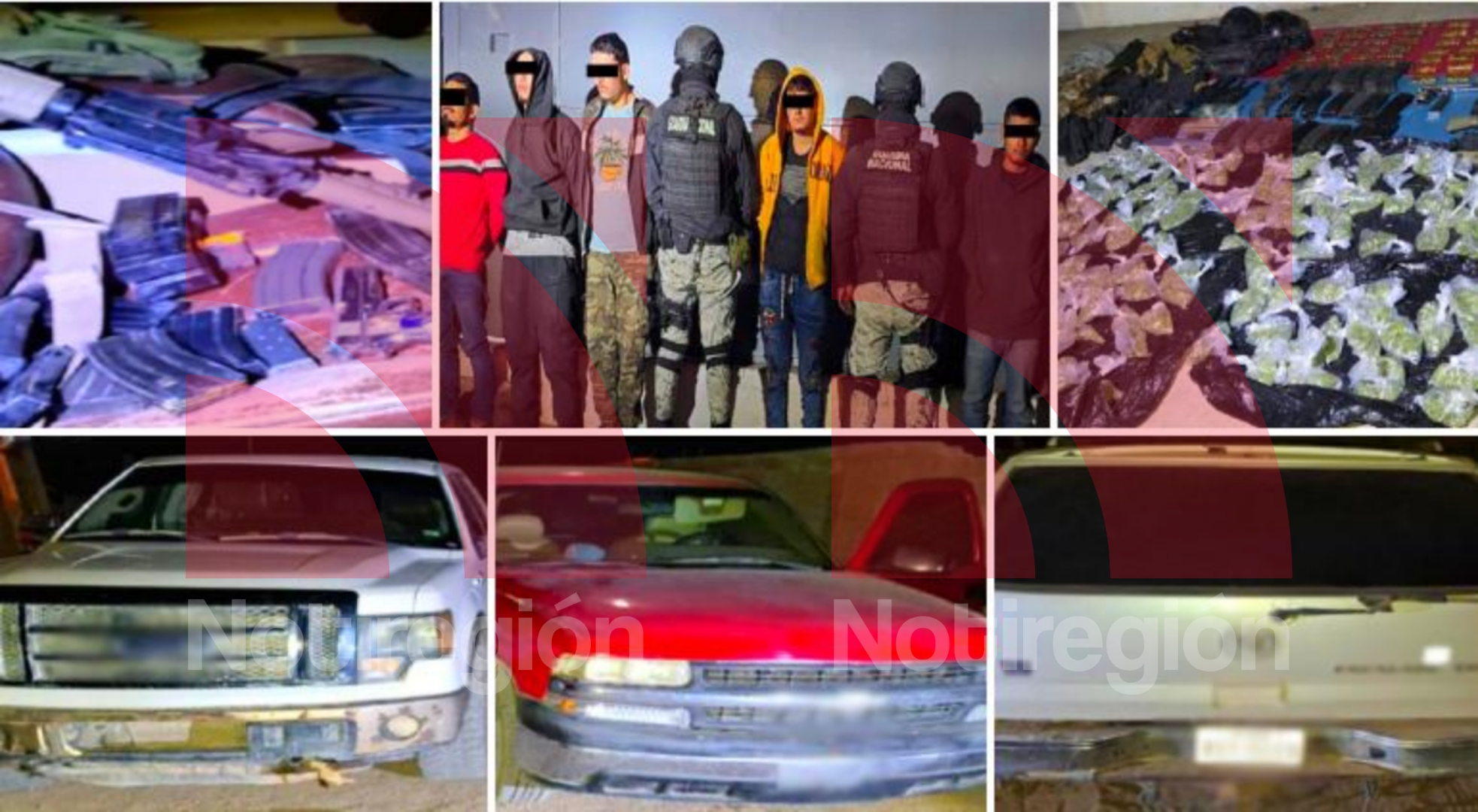 La Guardia Nacional (GN) sorprendió y arrestó a cinco sujetos en tres camionetas con marihuana y armas largas y una pistola en Puerto Palomas, municipio de Ascensión, en el noroeste del estado de Chihuahua.