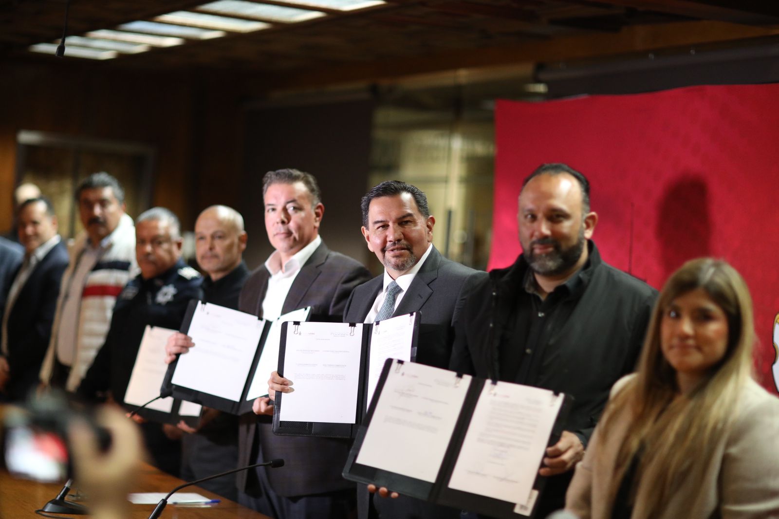 En la firma de convenio estuvieron el secretario del Ayuntamiento, Héctor Rafael Ortiz Orpinel; el secretario de Seguridad Pública Municipal, César Omar Muñoz; el coordinador general de Seguridad Vial, César Tapia y el coordinador general de Protección Civil, Sergio Rodríguez.