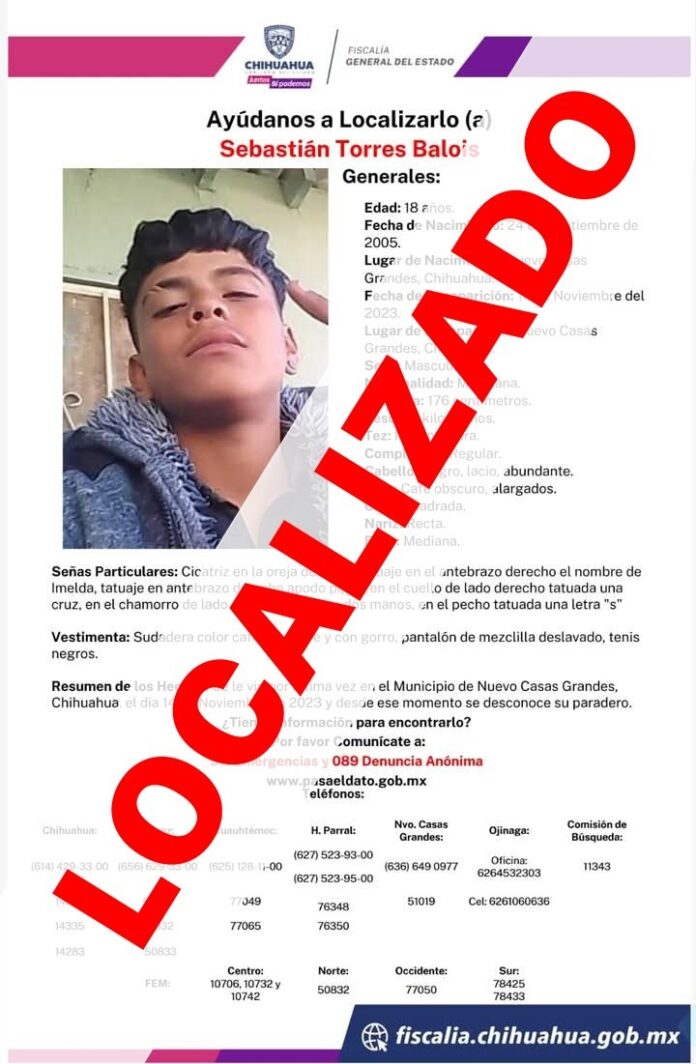 La Fiscalía de Distrito Zona Noroeste, informó que luego de diversas labores de búsqueda e investigación, se dio con el paradero de José Julián J.V., así como de Sebastián T. B., quienes contaban con reporte de desaparición desde el 14 de noviembre de 2023, en Nuevo Casas Grandes, Chihuahua.