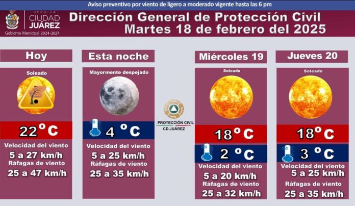 La Dirección General de Protección Civil informó sobre las condiciones climáticas para los próximos días, destacando un aviso preventivo por vientos ligeros a moderados vigente hasta las 18:00 horas de este martes.