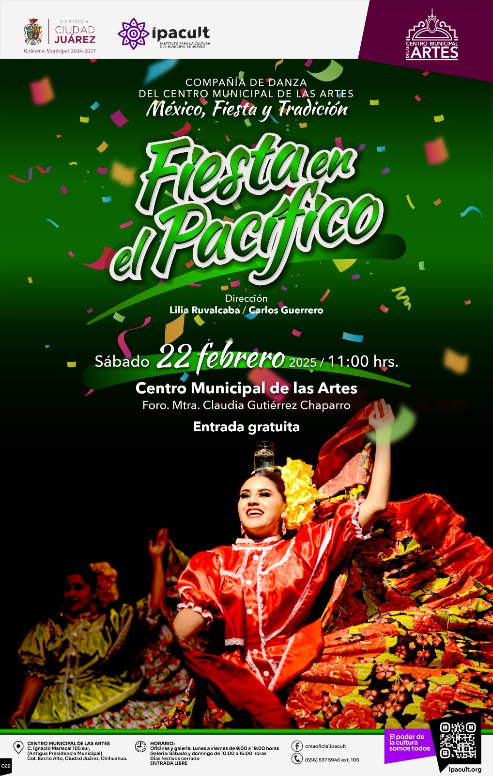 El Instituto para la Cultura del Municipio de Juárez (IPACULT) invita a la comunidad a disfrutar del espectáculo de danza “Fiesta en el Pacífico”, este próximo sábado 22 de febrero a las 11:00 de la mañana en el Centro Municipal de las Artes (CMA).