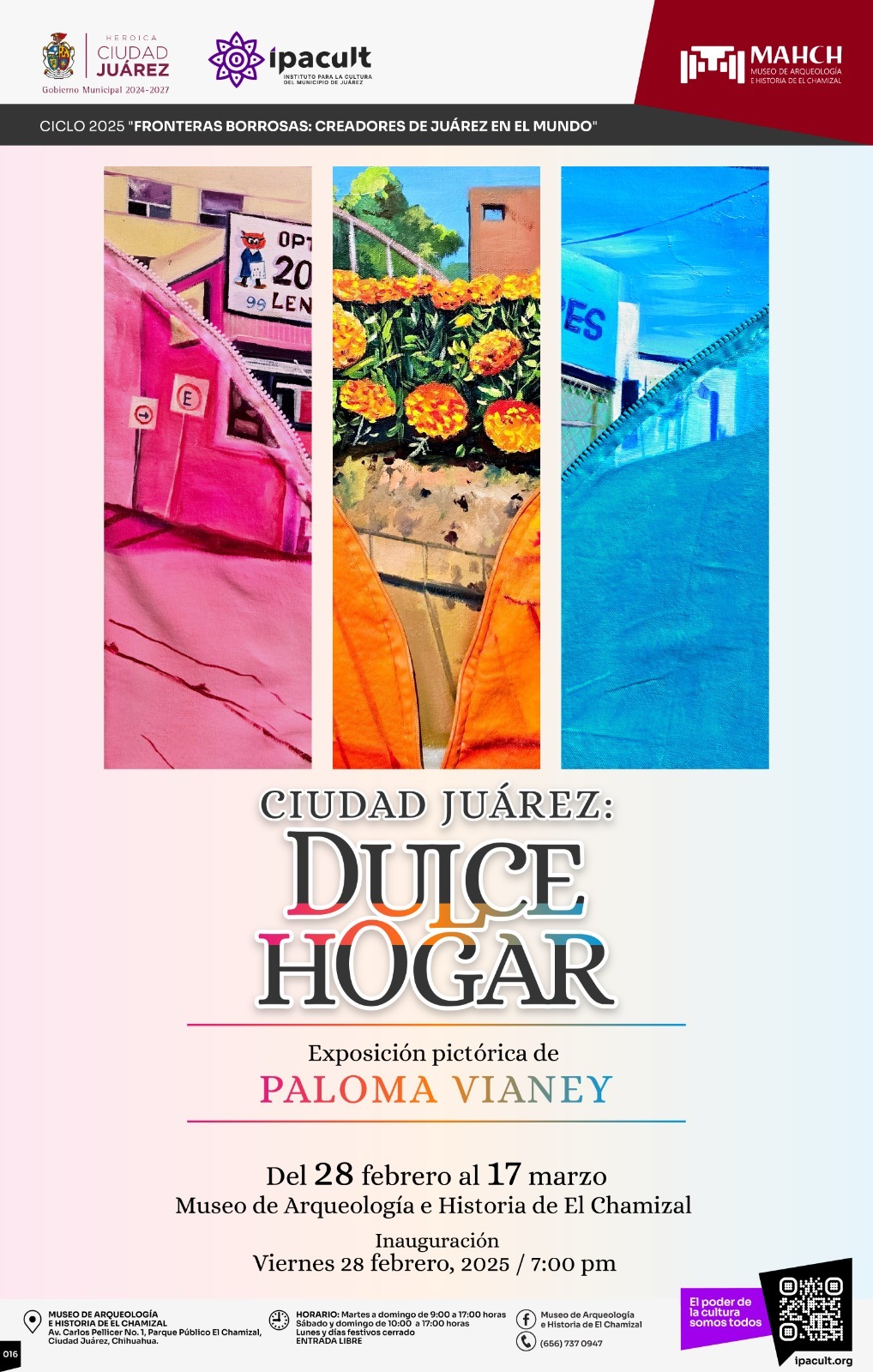 El Instituto para la Cultura del Municipio de Juárez (IPACULT) invita al público a la inauguración de la exposición pictórica “Ciudad Juárez: Dulce Hogar” de la reconocida artista Paloma Vianey, la cual se llevará a cabo el próximo viernes 28 de febrero a las 07:00 de la tarde en el Museo de Arqueología e Historia de El Chamizal (MAHCH).