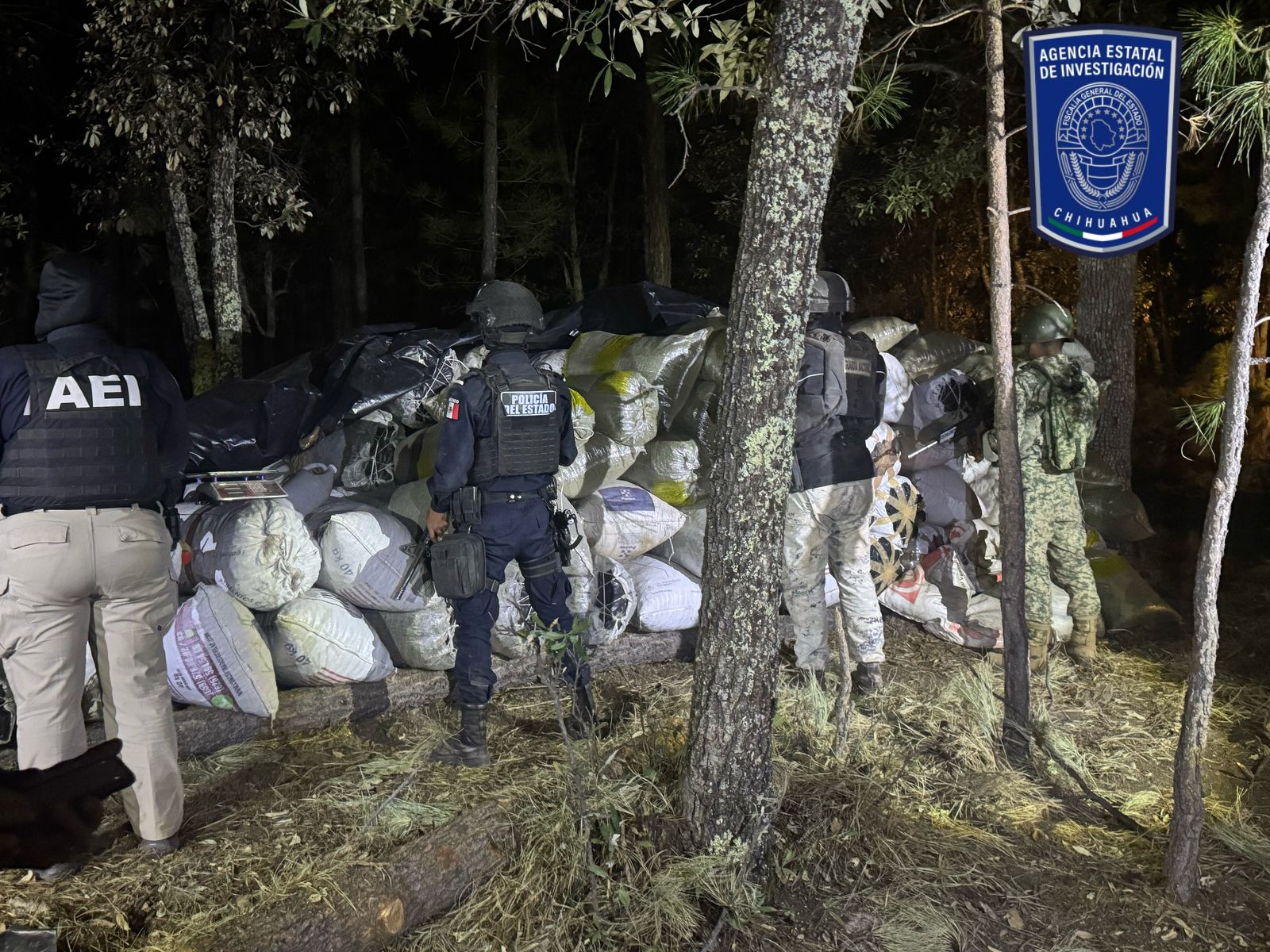 Durante un recorrido realizado en la zona serrana de Casas Grandes, elementos del grupo conocido como “células BOI” formado por AEI, SEDENA, G.N. Y Policía Estatal, ubicaron un campamento donde encontraron una gran cantidad de marihuana, en greña y en semilla, lo cual fue asegurado, siendo lo siguiente.                                                                                   117 costales completos, 12 costales a la mitad conteniendo una hierba verde, olorosa, con las características de la marihuana,1 lona con tallos de la planta, 1 lona con hierba verde   y 2 recipientes con capacidad de 3.5 litros cada uno conteniendo a su máxima capacidad lo que parece ser semilla de marihuana.                                                                                   Todo el producto fue puesto a disposición de las autoridades correspondientes.