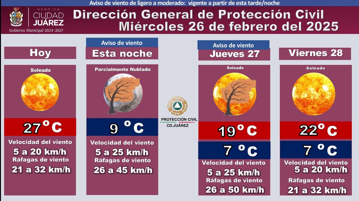 La Dirección General de Protección Civil emitió el pronóstico del clima para este miércoles 26, señalando condiciones mayormente soleadas con una temperatura máxima de 27 °C y una mínima de 9 °C durante la noche.