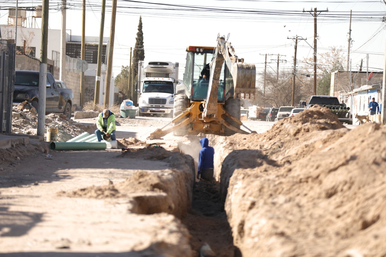 Daniel González García, titular de la dependencia, informó que en la calle Boquilla se realiza el corte, carga y el acarreo de material correspondiente para la nivelación del espacio, mientras que en la Hidalgo de Parral empezaron con la colocación de la línea de alcantarillado.
