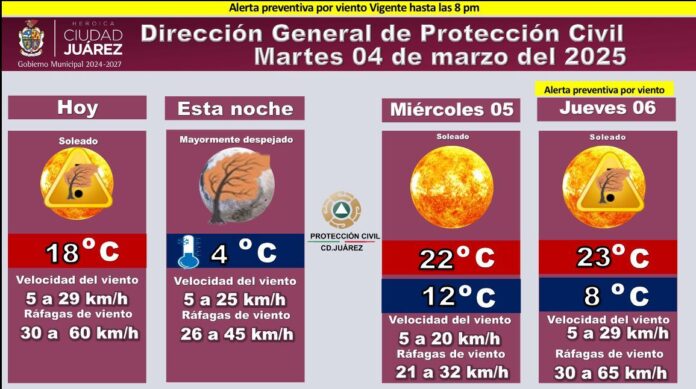 La Dirección General de Protección Civil de Ciudad Juárez informa que la alerta preventiva por viento se mantiene vigente hasta las 8 p.m. de este martes 4 de marzo de 2025, se prevé variaciones en la velocidad del viento durante esta mañana y tarde, y que la velocidad del viento descienda lentamente entre 5 pm y 12 am.