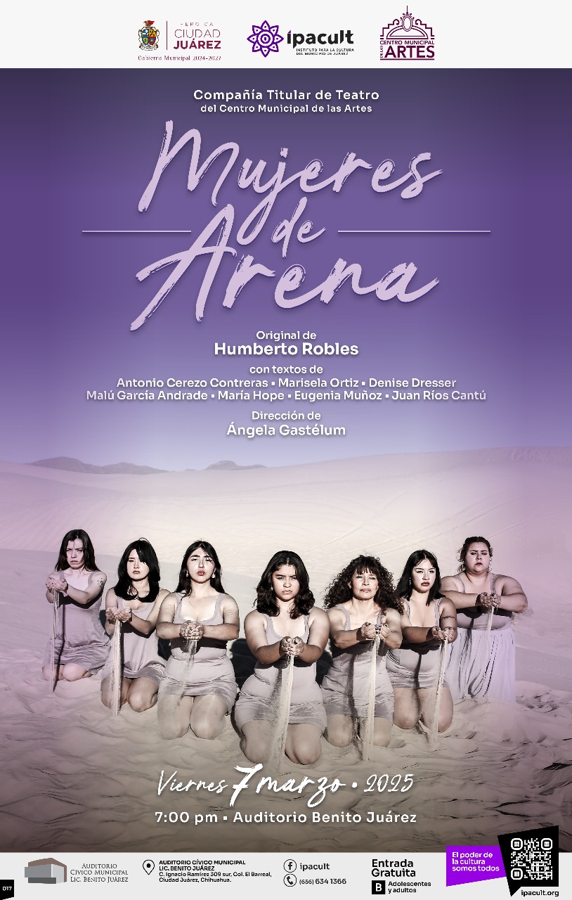El Auditorio Cívico Municipal Benito Juárez se convertirá en el escenario de la conmovedora obra documental “Mujeres de Arena”, presentada por el Instituto para la Cultura del Municipio de Juárez (IPACULT) y la Compañía de Teatro del Centro Municipal de las Artes (CMA) en el marco del Día Internacional de la Mujer.