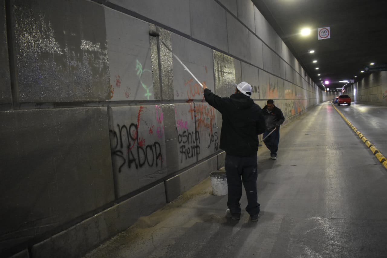 El escuadrón antigrafiti de la Dirección de Limpia, atendió este lunes el Centro Histórico de la Ciudad, con retiro de pintas en los muros del paso a desnivel de la avenida 16 de Septiembre, dio a conocer Gibran Solís Kanahan, director de la dependencia.