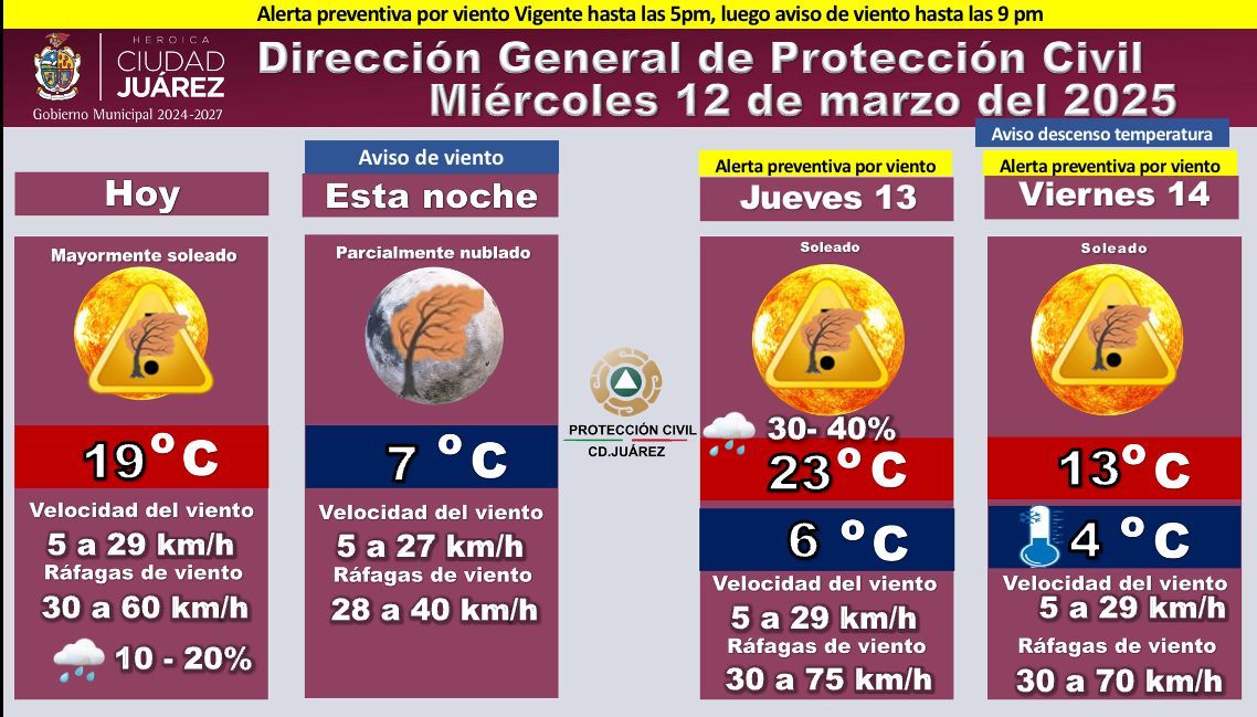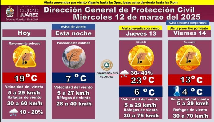 La Dirección General de Protección Civil de Ciudad Juárez ha emitido una alerta preventiva por vientos fuertes para este miércoles 12 de marzo de 2025.