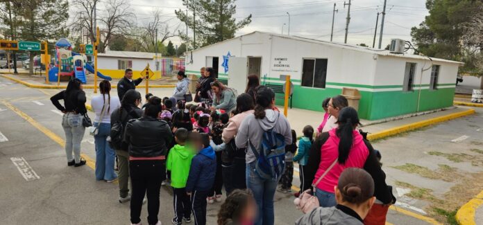 Los 43 niños, 14 padres de familia y cinco docentes de dicha institución que se encuentra entre las calles Mexicas y Tarascos de la colonia Azteca, aprendieron sobre la importancia y el respeto a la normatividad vial.