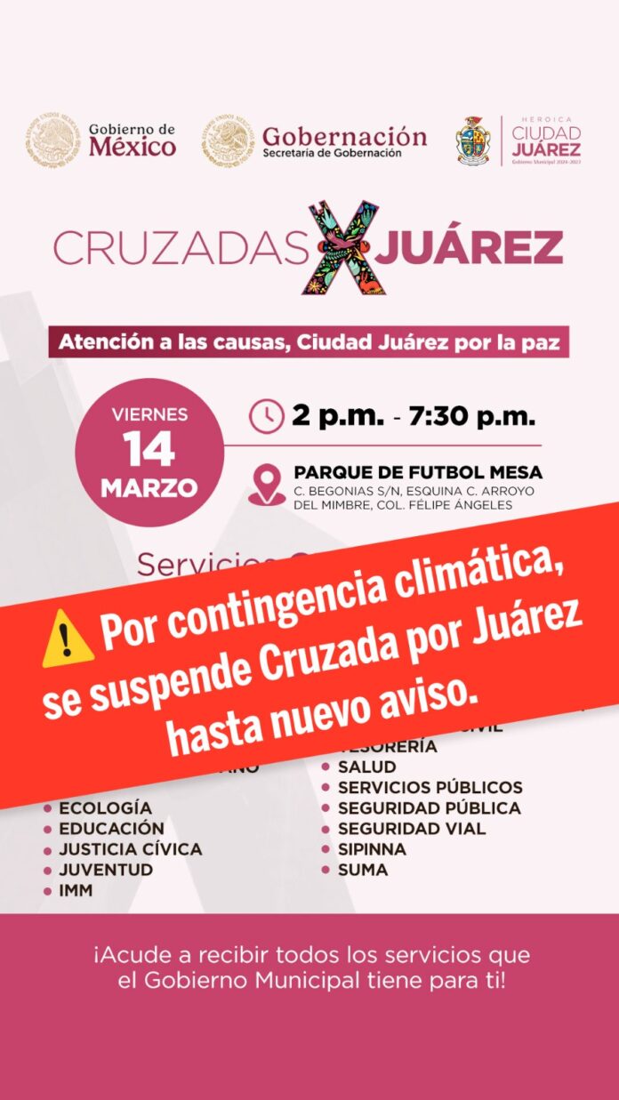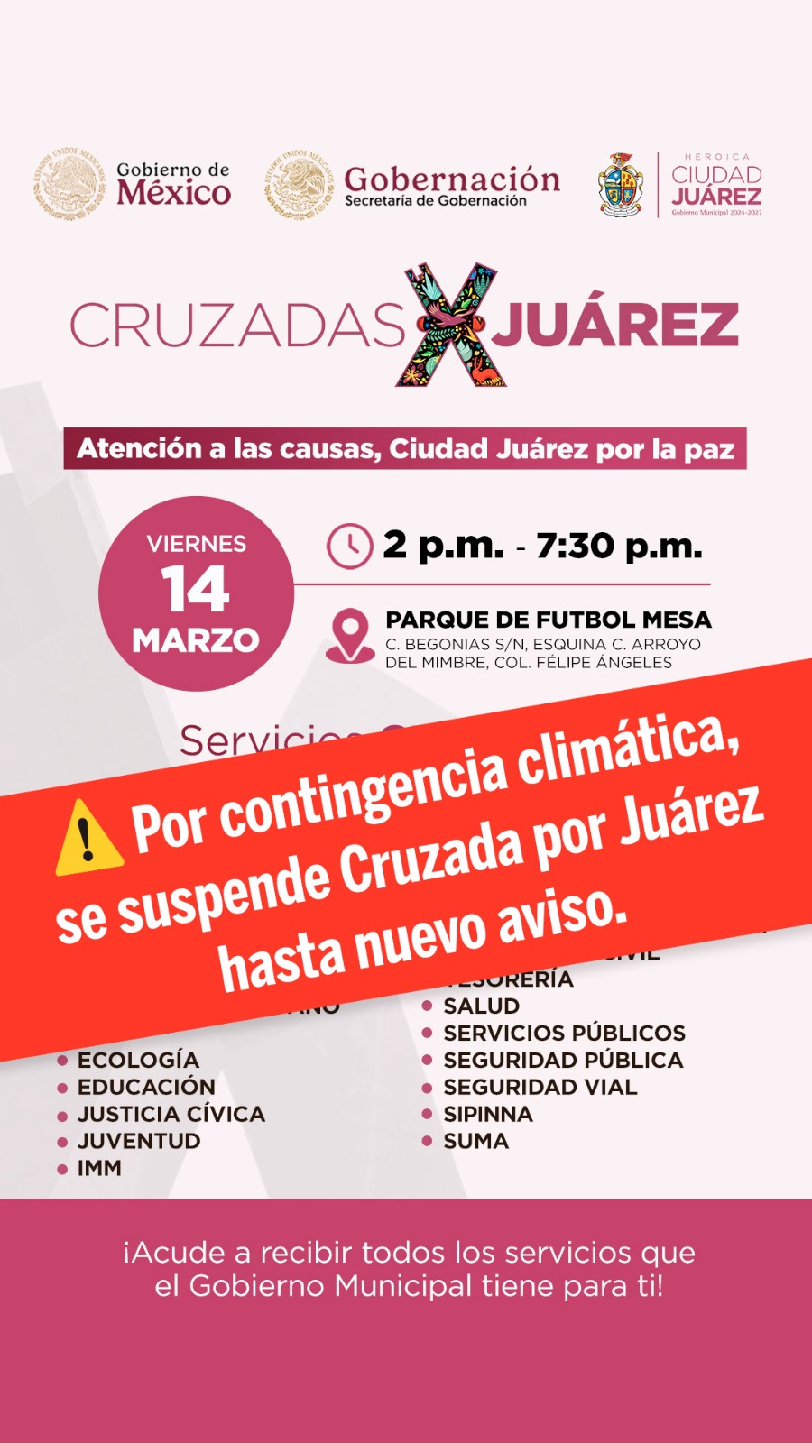 Debido a los fuertes vientos y bajas temperaturas que se pronostican para mañana viernes 14 de marzo, se suspende la Cruzada por Juárez “Atención a las causas, Juárez por la Paz”, que se llevaría a cabo en la colonia Felipe Ángeles.
