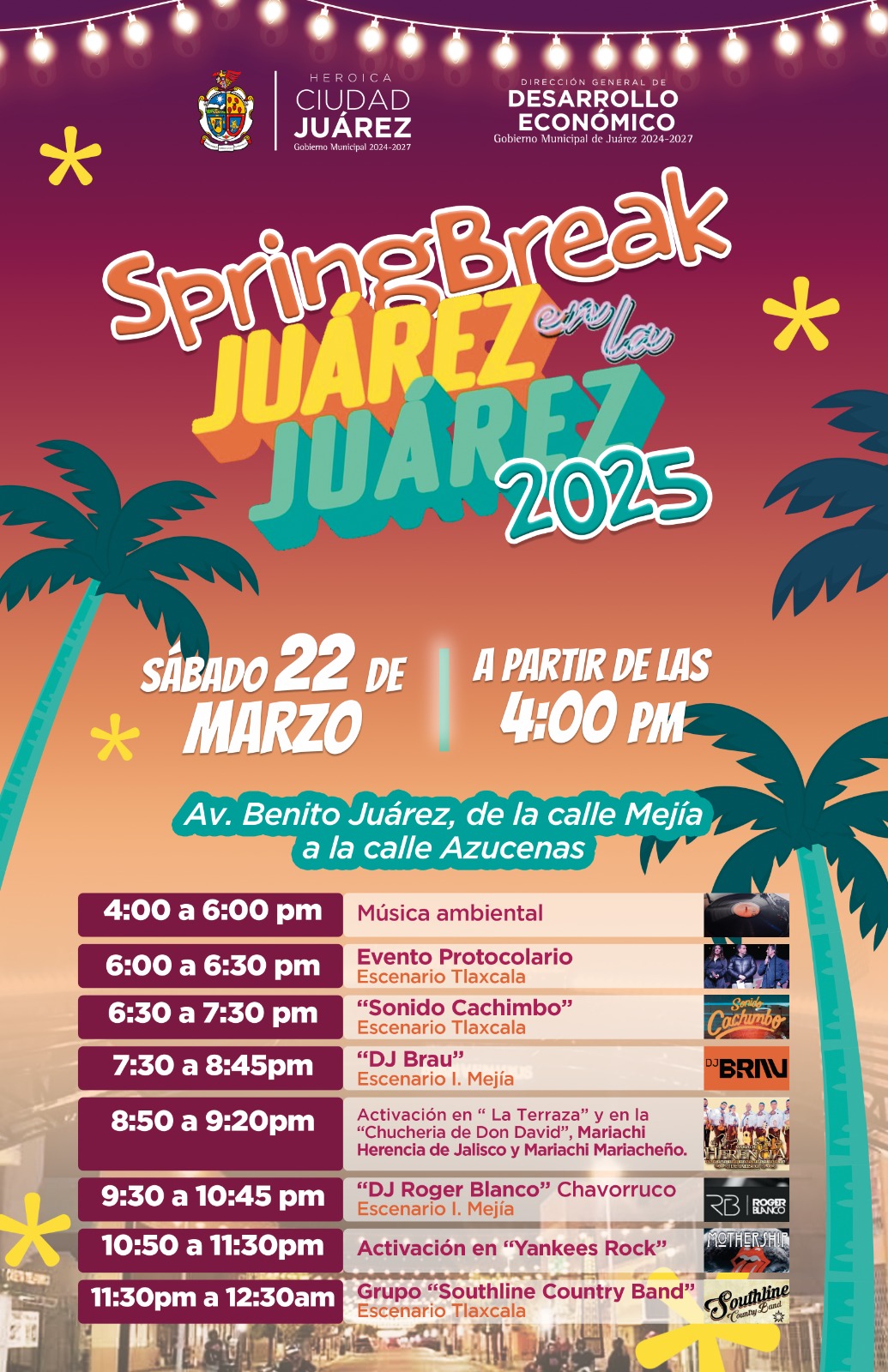Con el propósito de reactivar la economía y el turismo en la emblemática avenida Juárez, el próximo sábado 22 de marzo se llevará a cabo la segunda edición del evento “Juárez en la Juárez”, esta vez bajo la temática de Spring Break, dieron a conocer autoridades municipales en conferencia de prensa.