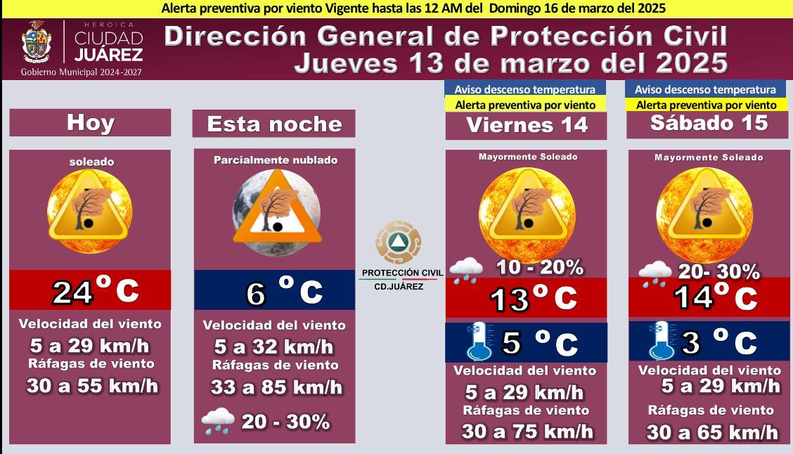 La Dirección General de Protección Civil emitió una alerta preventiva por viento vigente hasta las 12:00 de la noche del domingo 16 de marzo.