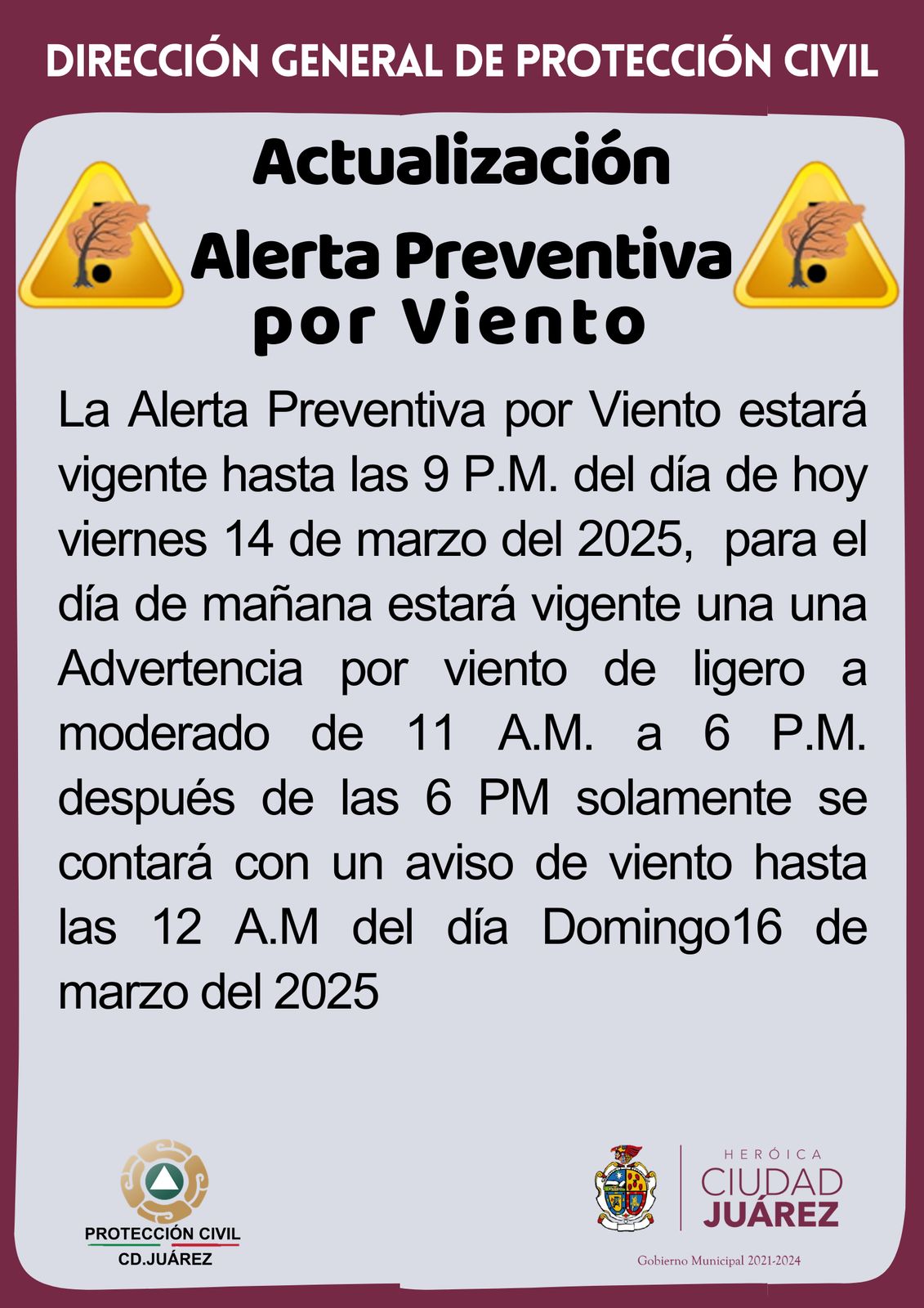 El pronóstico del tiempo indica que la alerta preventiva por viento seguirá vigente hasta las 9:00 de la noche de hoy viernes 14, ya que se espera que las velocidades del viento disminuyan después de esa hora, manteniéndose mayormente ligero desde la noche hasta las 10:00 de la mañana del sábado, dio a conocer el director de Protección Civil, Sergio Rodríguez.