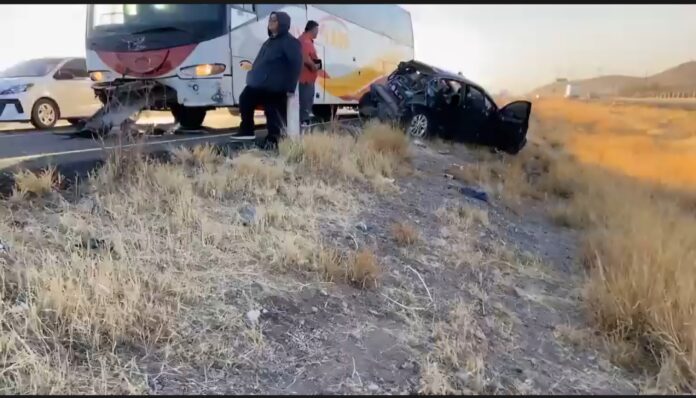 El conductor de un camión de pasajeros de Rápidos de Delicias no alcanzó a detenerse y se impactó fuertemente contra un vínculo Nissan Sentra de color negro.
