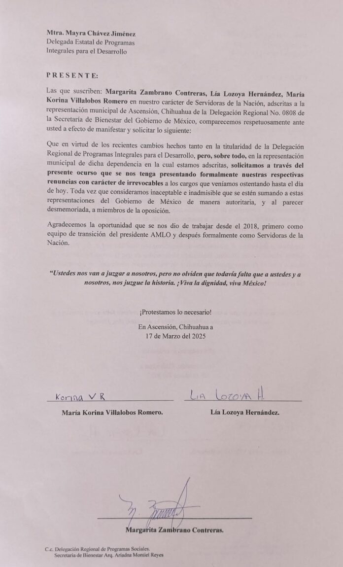 Además se inconforman por el trato recibido por parte de la delegada regional y del mismo coordinador municipal, lo que consideran injusto y es por eso que decidieron presentar su renuncia con carácter de irrevocable, ya que durante varios años estuvieron trabajando de tiempo completo para el partido y la secretaría para ahora estar recibiendo malos tratos.