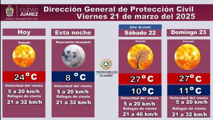 La velocidad del viento se mantendrá en un rango de los 5 a los 20 kilómetros por hora, con ráfagas de hasta 32 kilómetros por hora.