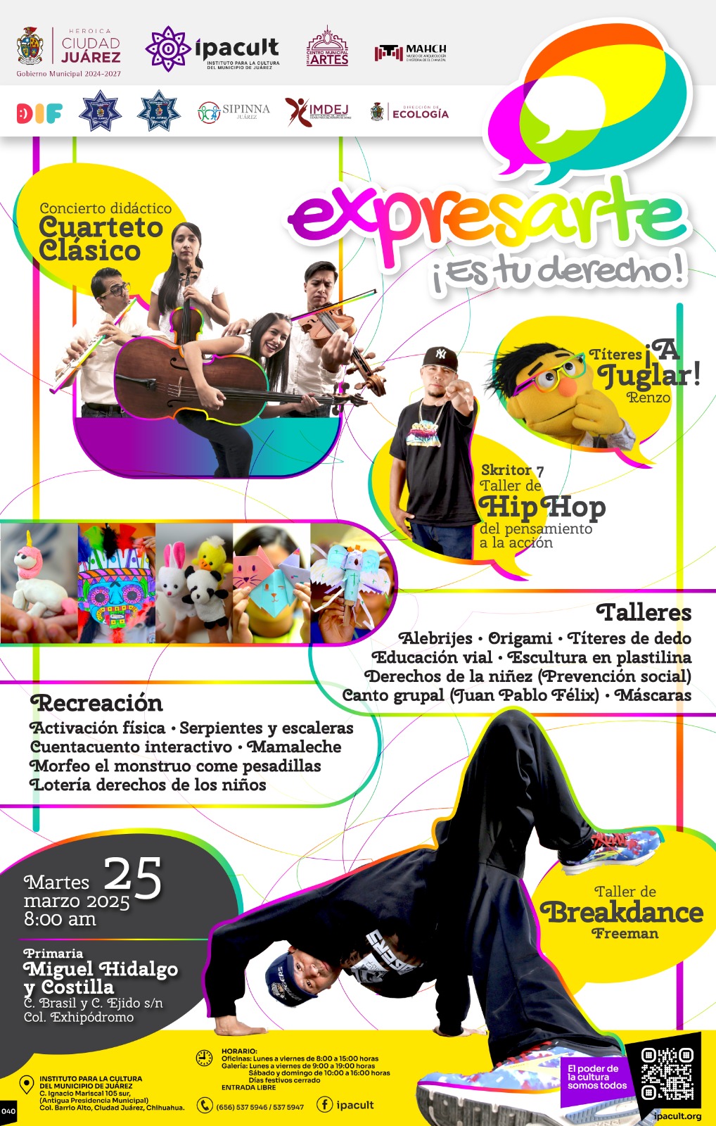 Con el objetivo de acercar la cultura y la educación sobre los derechos de la infancia a los más pequeños, el Instituto para la Cultura del Municipio de Juárez (IPACULT) llevará su programa “Expresarte: es tu derecho” a la Escuela Primaria Miguel Hidalgo este martes 25 de marzo a las 8:00 de la mañana.