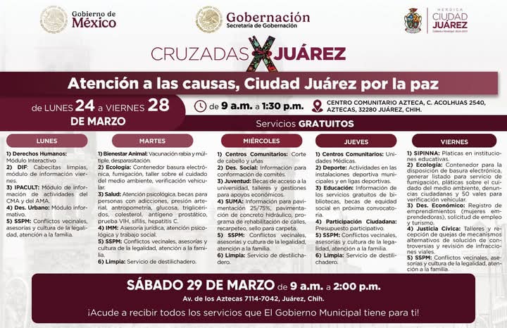 Este próximo sábado 29 de marzo, de 9:00 de la mañana a 2:00 de la tarde, se llevará a cabo la Cruzada por Juárez “Atención a las causas, Juárez por la Paz”, en la avenida de Los Aztecas 7114-7042, en la colonia Azteca.
