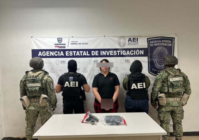 Elementos de la Agencia Estatal de Investigación, adscritos al Centro de Operaciones Estratégicas de la Fiscalía de Distrito Zona Norte, detuvieron a una mujer identificada como Jaqueline Lorein R. F., por posesión ilegal de arma de fuego, en la colonia de El Granjero, en Ciudad Juárez.