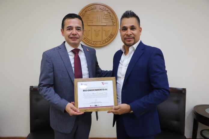 Este día, el director del Instituto Municipal del Deporte y Cultura Física de Juárez (IMDEJ), Juan Escalante, entregó un reconocimiento al rector de la Universidad Autónoma de Ciudad Juárez, Daniel Alberto Constandse Cortez.