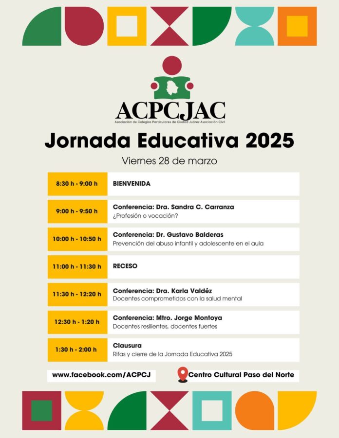 “Esta jornada educativa fue organizada por la Asociación de Colegios Particulares de Ciudad Juárez A.C. (ACPCJAC), de la cual nuestra institución forma parte dentro de la Zona 104 de la Secretaría de Educación y Deporte Zona Norte”, informó la titular de la dependencia, Yossy Yazmín Narváez González.