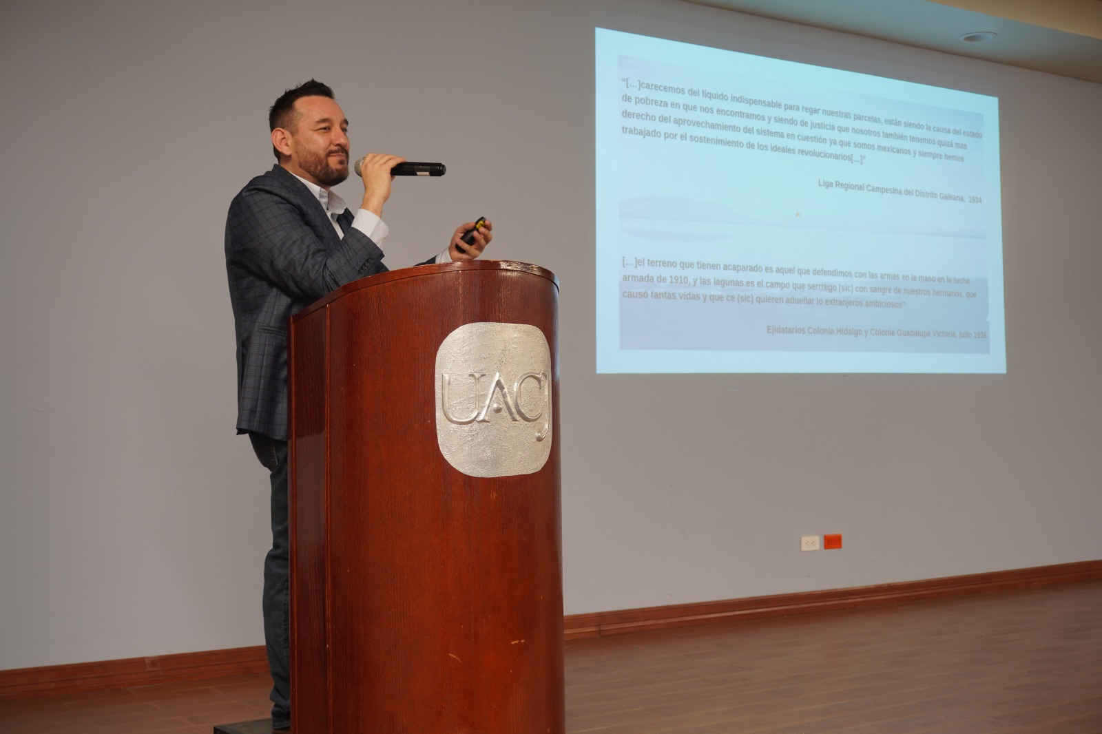 Para ejemplificar los discursos analizados, los asistentes pudieron apreciar extractos de documentos históricos, como el fechado en julio de 1936 emitido por Ejidatarios de Colonia Hidalgo y Colonia Guadalupe Victoria en el que expresan “… el terreno que tienen acaparado es aquel que defendimos con las armas en la mano en la lucha armada de 1910, y las lagunas es el campo que serrego (sic) con sangre de nuestros hermanos, que causó tantas vidas y que ce (sic) quieren adueñar los extranjeros ambiciosos”.